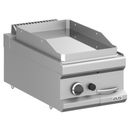 • La placa de cocción totalmente encerrada en la encimera de trabajo está hecha de acero dulce, con acabado pulido o en cromo duro, y tiene espesor de 15 mm.