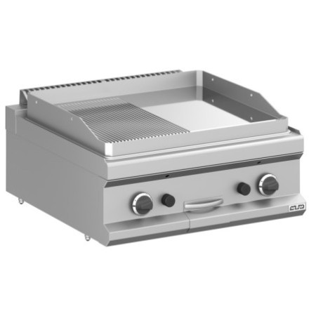 • La placa de cocción totalmente encerrada en la encimera de trabajo está hecha de acero dulce, con acabado pulido o en cromo duro, y tiene espesor de 15 mm.