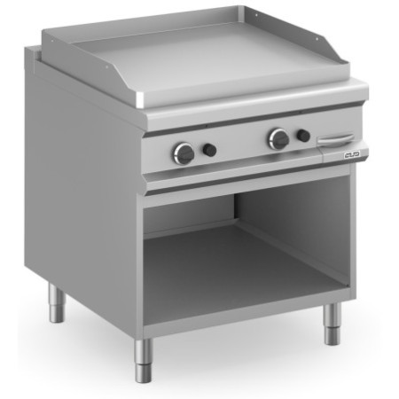 •La placa de cocción totalmente encerrada en la encimera de trabajo está hecha de acero dulce, con acabado pulido o en cromo duro, y tiene espesor de 15 mm.