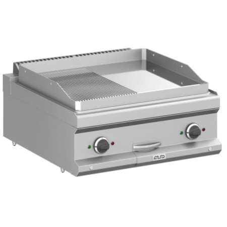 • La placa de cocción totalmente encerrada en la encimera de trabajo está hecha de acero dulce, con acabado pulido o en cromo duro, y tiene espesor de 15 mm.