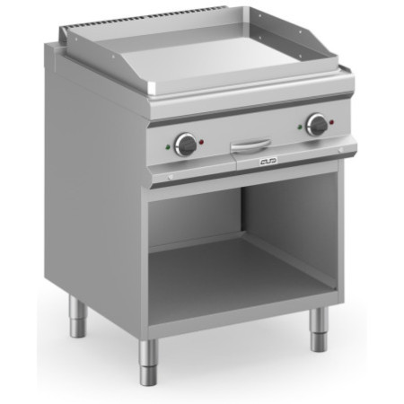 • La placa de cocción totalmente encerrada en la encimera de trabajo está hecha de acero dulce, con acabado pulido o en cromo duro, y tiene espesor de 15 mm.