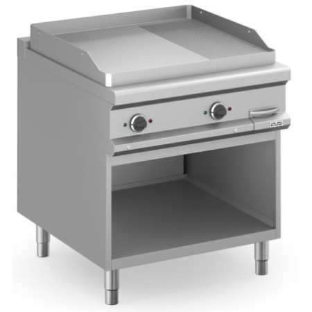 •La placa de cocción totalmente encerrada en la encimera de trabajo está hecha de acero dulce, con acabado pulido o en cromo duro, y tiene espesor de 15 mm.
